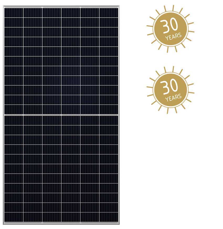 This monocrystalline solar module, in half-cell architecture and glass-glass construction with white mesh backing, impresses with its very high wattage. As a "higher yield module" it's ideal for usage in commercial plants, and large-scale plants.